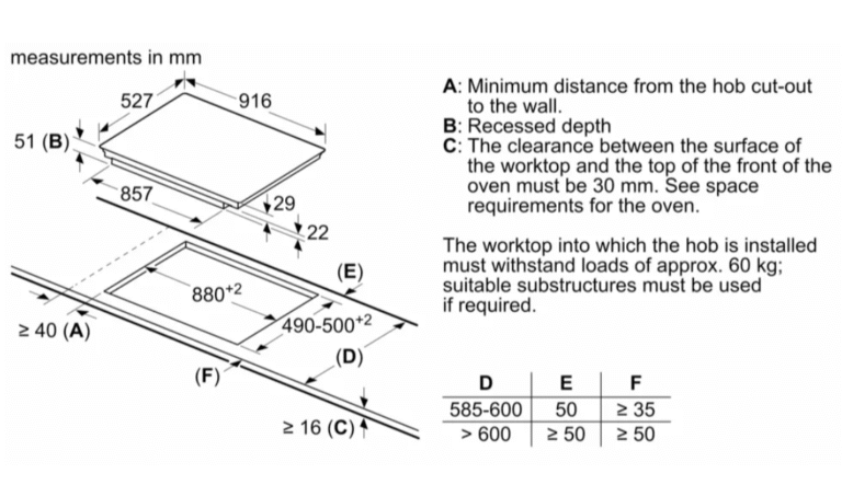 Kích thước của bếp là 51 x 961 x 527 mm với tổng trọng lượng 22.7kg, phù hợp với không gian bếp rộng lớn và dễ dàng lắp âm trong tủ bếp.
