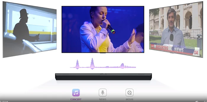 Loa soundbar LG này trang bị công nghệ AI Sound Pro giúp phát hiện nội dung bạn xem như phim, tin tức, thể thao,… tự động điều chỉnh phù hợp với từng thể loại để áp dụng cài đặt lý tưởng.