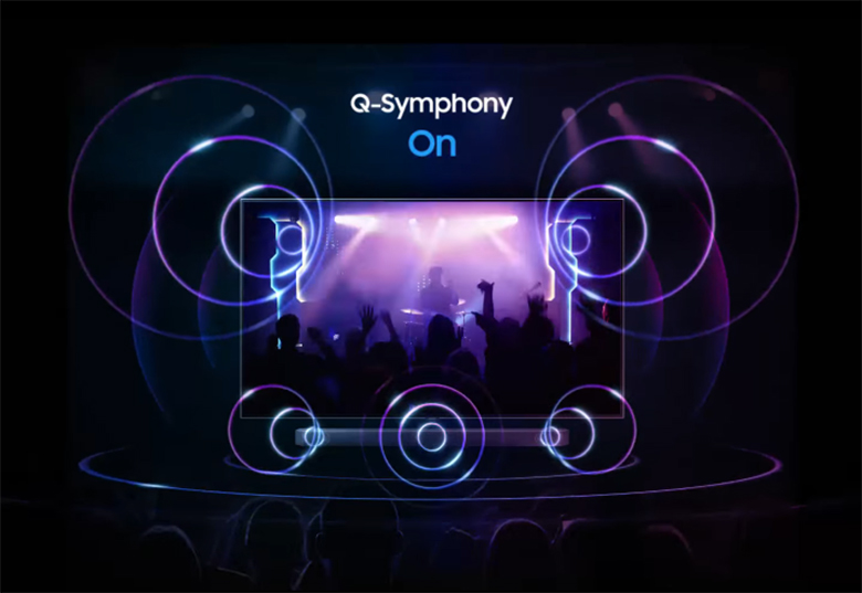 Nhờ công nghệ Q-Symphony âm thanh được đồng bộ một cách hoàn hảo giữa hai loa tầm cao trên QLED TV với hệ thống loa trước, loa cạnh bên và loa đánh trần trên soundbar giúp kiến tạo nên một không gian giải trí đỉnh cao, hoàn hảo bao trùm không gian âm nhạc sống động.