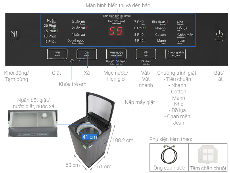 Thiết kế lồng đứng hiện đại: Thân máy màu bạc sang trọng, bảng điều khiển phía sau giúp thao tác thuận tiện, hạn chế tiếp xúc với nước và bảo vệ cột sống người dùng khi lấy đồ.