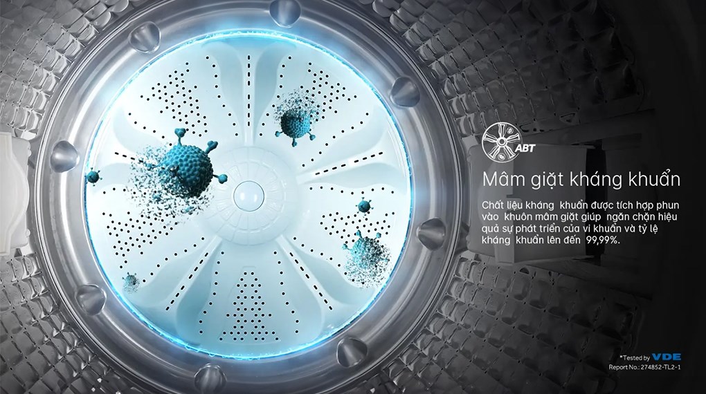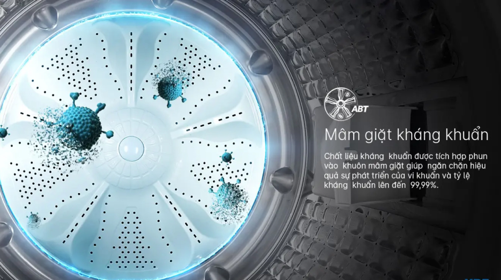 Mâm giặt kháng khuẩn ABT: Được phun chất liệu kháng khuẩn đặc biệt, giúp ngăn chặn hiệu quả sự phát triển của vi khuẩn và nấm mốc bên trong lồng giặt đến 99,99%.