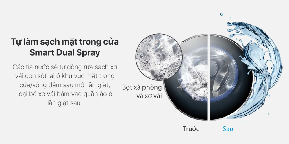 Smart Dual Spray cuốn trôi mọi cặn bẩn bám trên mặt trong cửa máy giặt