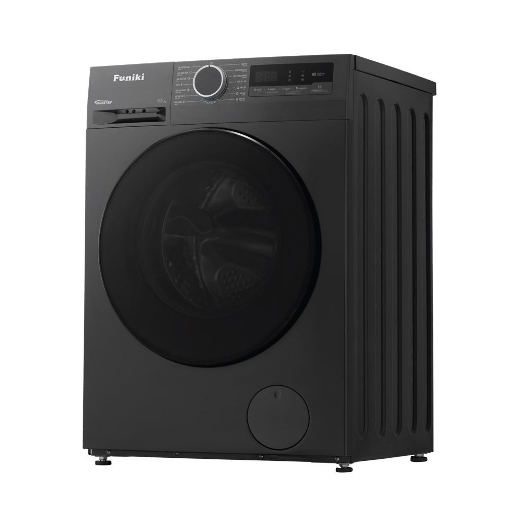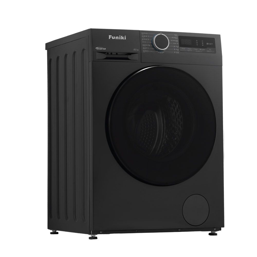 Máy giặt Funiki Inverter 12.5kg HWM F8125ADG nổi bật với kiểu dáng máy giặt cửa trước – lồng ngang, thiết kế hình khối chữ nhật đứng chắc chắn và tông màu xám đậm thanh lịch, phù hợp với nhiều không gian nội thất.