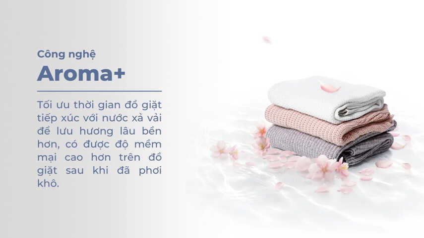 Máy tích hợp công nghệ Aroma+, giúp quần áo không chỉ sạch mà còn giữ hương thơm lâu hơn sau khi phơi khô. Công nghệ này tối ưu hóa nhiệt độ nước, độ hòa tan của nước xả vải và thời gian tiếp xúc với sợi vải, giúp hương thơm thấm sâu hơn vào từng thớ vải. Đồng thời, Aroma+ còn giúp làm mềm sợi vải, mang lại cảm giác dễ chịu khi mặc, nâng cao trải nghiệm giặt giũ cho người dùng.