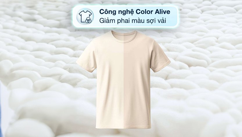 – Công nghệ Color Alive, giúp giảm phai màu sợi vải, giữ quần áo luôn như mới. Công nghệ này kết hợp nước lạnh và siêu sóng nước, vừa giặt sạch hiệu quả, vừa bảo vệ màu sắc vải, hạn chế tình trạng bạc màu sau nhiều lần giặt. Ngoài ra, giặt với nước lạnh còn giúp tiết kiệm điện năng đáng kể, góp phần tối ưu chi phí sinh hoạt mà vẫn đảm bảo hiệu suất giặt giũ tối ưu.