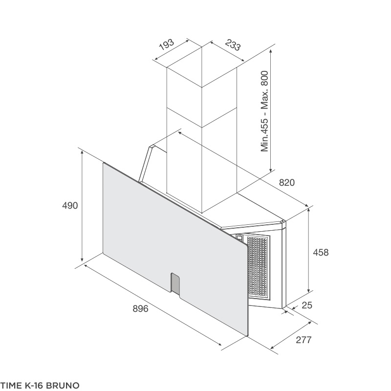 Hút mùi Malloca TIME K-16 BRUNO có kích thước W896 x D277 x H(913-1258) mm phù hợp với nhiều không gian bếp