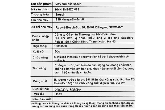 – Máy rửa bát có công suất hoạt động 2400W và tiêu thụ lượng nước sử dụng cho mỗi lần rửa là khoảng 9.5 lít, có thể rửa được 14 bộ châu Âu (tương đương 3 – 4 bữa ăn).