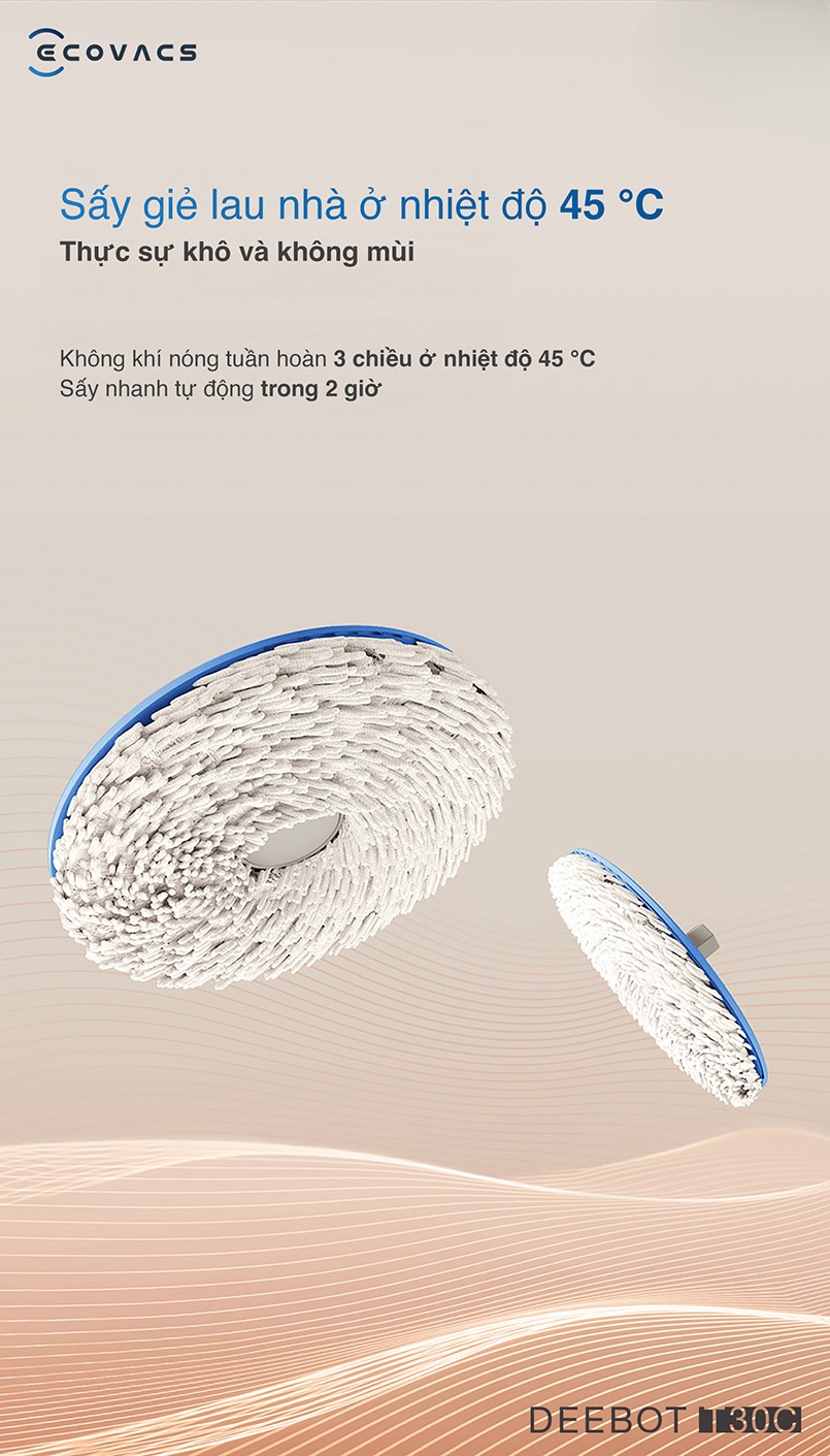Tính năng tự động làm sạch giúp bạn không cần lo lắng về việc giặt giẻ lau thủ công. Robot sẽ sử dụng các lưỡi cạo đặc biệt trong một khoang riêng để làm sạch giẻ lau. Kết hợp cùng nước nóng 75°C hòa tan bụi bẩn và các vết dầu mỡ cứng đầu. Tiếp theo, giẻ lau sẽ được sấy khô bằng khí nóng 45°C cho đến khi khô hoàn toàn, tránh ẩm mốc và mùi hôi khó chịu, luôn sẵn sàng cho lần sử dụng tiếp theo.