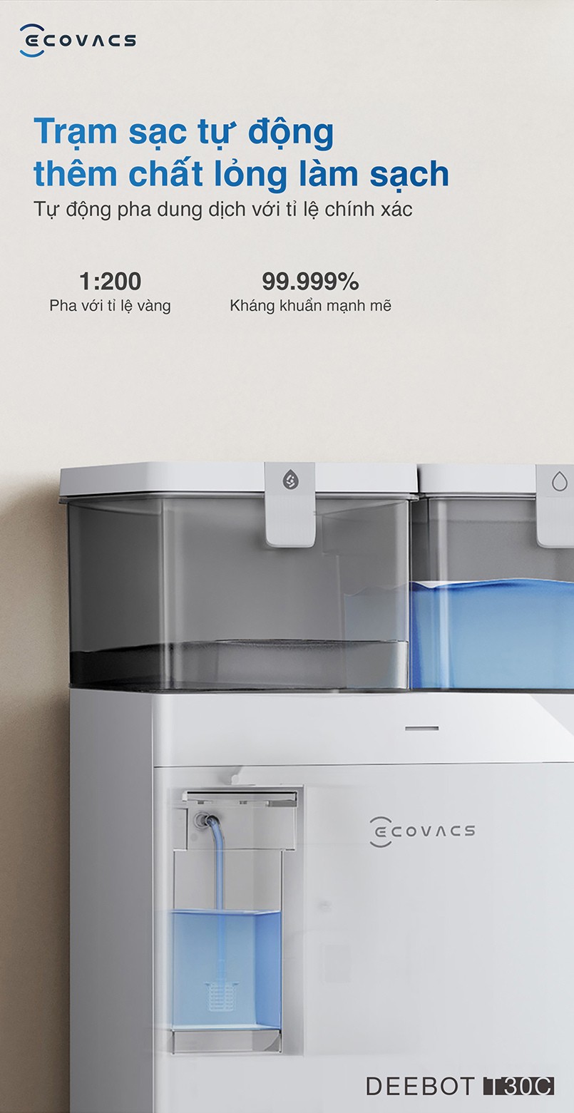 Với khả năng tự động thêm dung dịch làm sạch, Ecovacs T30C giúp bạn tiết kiệm tối đa thời gian và công sức. Robot sẽ tự động pha dung dịch tẩy rửa với nước sạch theo tỉ lệ chuẩn 200:1, loại bỏ hoàn toàn việc bạn phải tự tay thêm dung dịch mỗi lần lau nhà, đồng thời đảm bảo sàn nhà luôn được chăm sóc một cách tốt nhất, kháng khuẩn mạnh mẽ 99.99%.