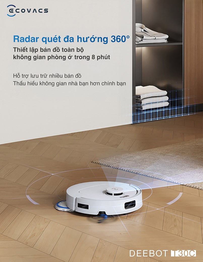 Công nghệ TrueMapping 2.0 quét bản đồ nhanh và thiết lập lộ trình làm sạch thông minh tương ứng với điều kiện môi trường, đảm bảo mọi khu vực đều được làm sạch kỹ lưỡng. Với radar quét đa hướng 360 độ, robot có thể lập bản đồ một khu vực rộng 96m2 chỉ trong 8 phút (Theo kết quả phòng thí nghiệm Ecovacs, thời gian thực tế có thể thay đổi). Công nghệ này còn giúp robot hút bụi Ecovacs Deebot T30C cải thiện khả năng tránh chướng ngại vật và tối ưu lộ tình làm sạch, có thể di chuyển trơn tru trong những khu vực phức tạp như dưới gầm bàn ăn mà không bị mắc kẹt. Với khả năng lưu trữ nhiều bản đồ, người dùng có thể tối ưu hóa cho từng khu vực và robot sẽ tự động chuyển đổi giữa các bản đồ. Ngoài ra, cảm biến chống rơi tự động sẽ bảo vệ robot khỏi nguy cơ rơi cầu thang.