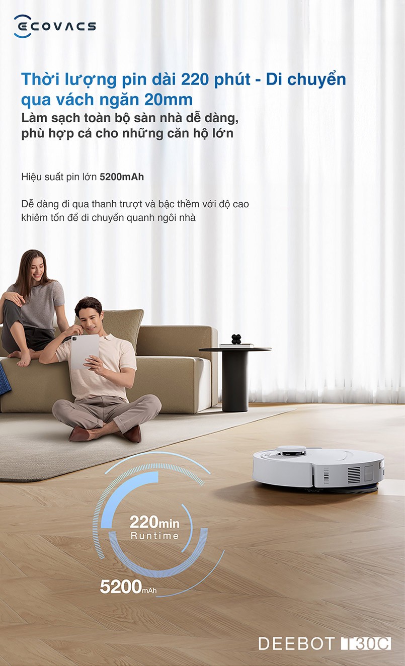 Trang bị viên pin dung lượng lớn 5200mAh hoạt động liên tục đến 220 phút chỉ với 1 lần sạc đầy (Theo kết quả phòng thí nghiệm Ecovac, thời gian làm thực tế có thể thay đổi). Điều này đảm bảo quá trình làm sạch không bị gián đoạn, cho phép robot dọn dẹp một khu vực rộng lớn và không bỏ sót bất kỳ vết bẩn nào, đồng thời giảm số lần bạn cần sạc pin cho robot.