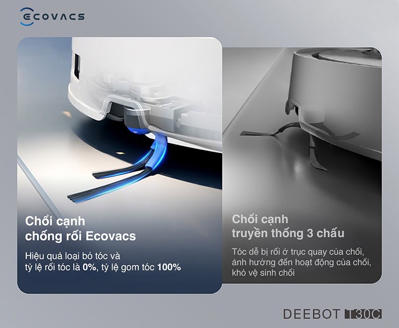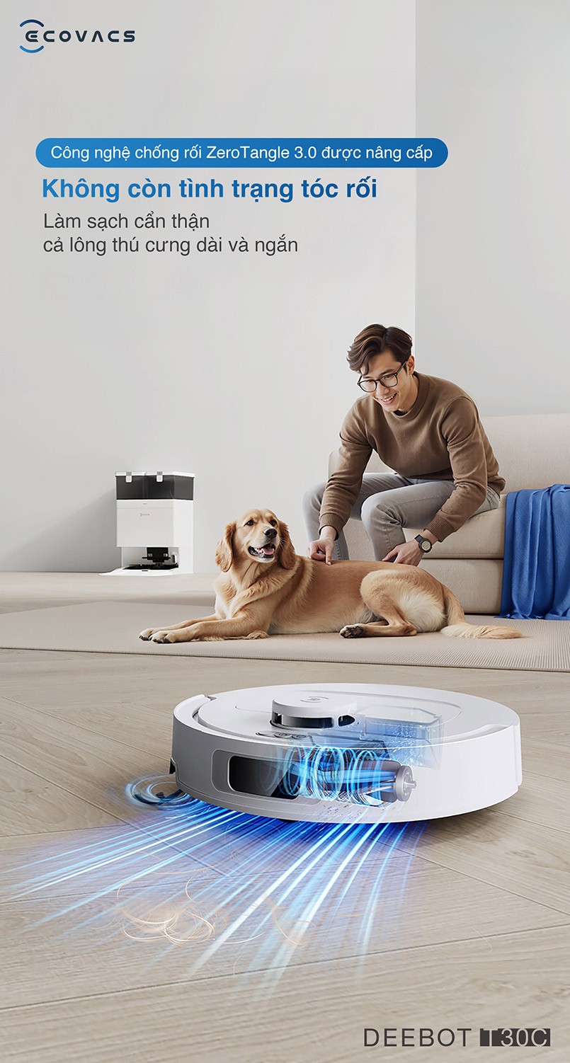 Ecovacs Deebot T30C là robot hút bụi lau nhà tự động thế hệ mới, được trang bị công nghệ chống rối ZeroTangle 3.0 cải tiến, phát triển dựa trên phiên bản ZeroTangle 2.0. Hệ thống cải tiến này tích hợp chổi cạnh chống rối ARClean và cấu trúc chống rối Triple-V tiên tiến, đảm bảo hiệu quả làm sạch mà không bỏ sót bất kỳ sợi tóc rối nào.