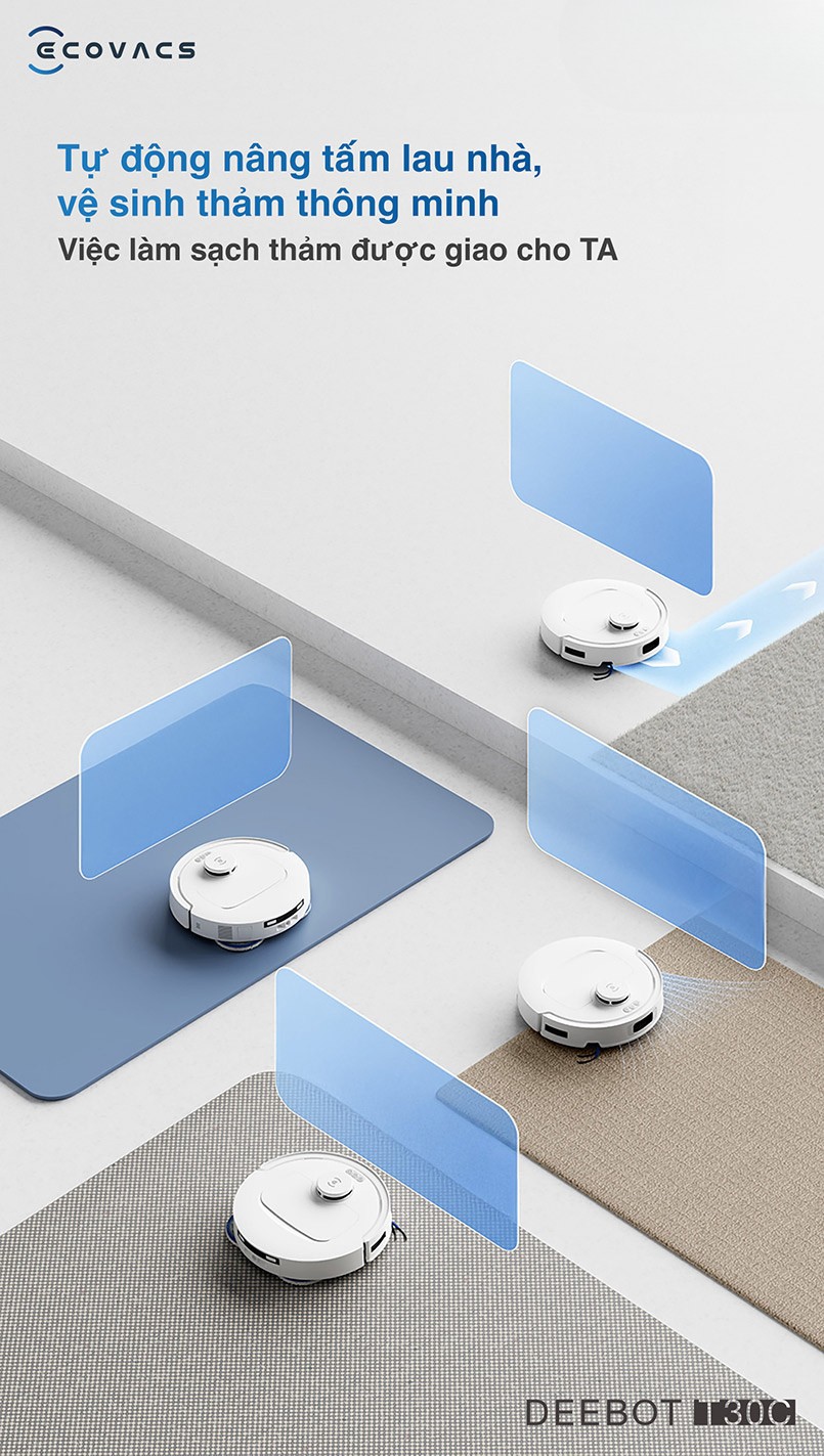 Bên cạnh đó, robot lau nhà Ecovacs Deebot T30C còn có thể tự động nhận biết các loại thảm khác nhau. Dựa vào đó, tự động chọn chế độ làm sạch phù hợp nhất, ví dụ như chỉ hút bụi, không đi vào, chỉ đi lướt qua hoặc chỉ lau sàn ở những khu vực khác. Điều này giúp robot vệ sinh thảm của bạn một cách chuyên nghiệp và hiệu quả nhất, đặc biệt thích hợp với các gia đình sử dụng nhiều thảm.
