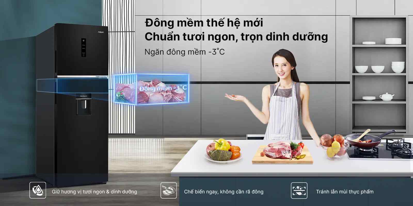 Công nghệ ngăn đông mềm thế hệ mới trên tủ lạnh Aqua AQR-T400FA(WFB) được thiết kế riêng biệt giúp bảo quản thực phẩm tươi sống như thịt, cá ở nhiệt độ -3 độ C, đảm bảo thực phẩm luôn tươi ngon và dinh dưỡng, giúp bạn nhanh chóng chế biến thực phẩm mà không phải chờ đợi rã đông, đồng thời tránh lẫn mùi với các loại thực phẩm khác.
