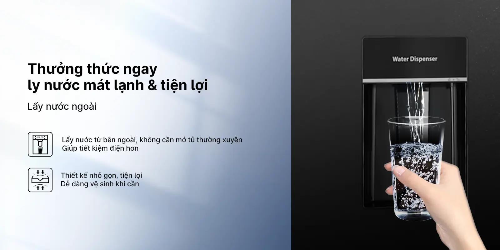 Với tính năng lấy nước ngoài thông minh trên tủ lạnh Aqua AQR-T400FA(WFB), người dùng có thể nhanh chóng tận hưởng được những ly nước mát lạnh, sảng khoái mà không cần phải mở tủ, hạn chế tình trạng khí lạnh thoát ra ngoài, giúp tiết kiệm năng lượng đáng kể.