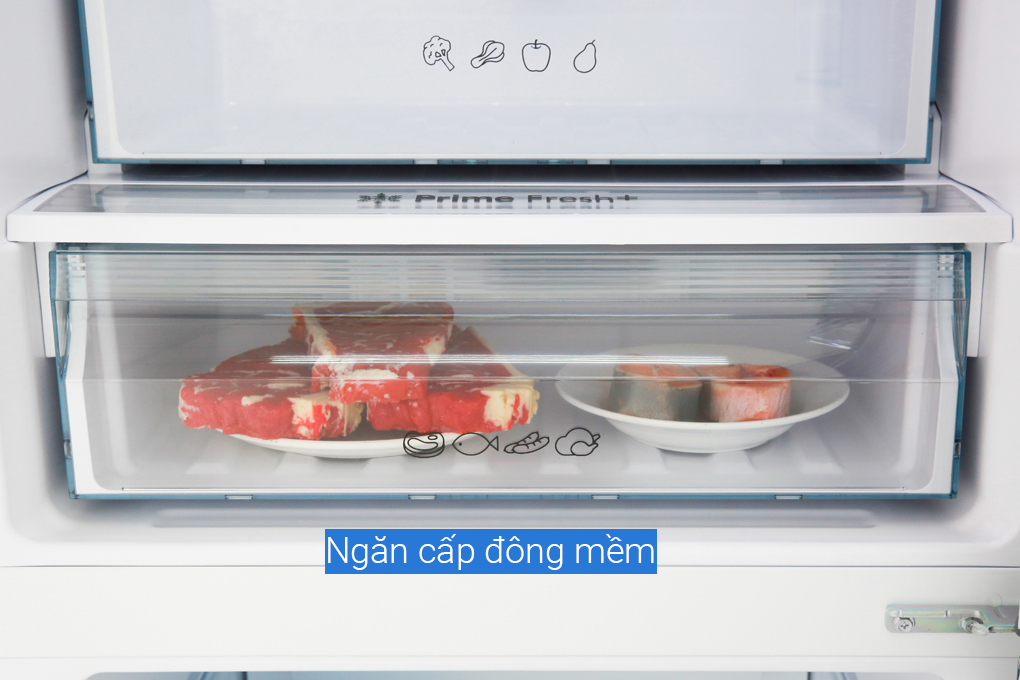 Ngăn đông mềm thế hệ mới Prime Fresh+ với mức nhiệt độ ở -3 độ C giúp thực phẩm tươi sống được làm đông nhanh hơn và tươi mới lên đến 7 ngày mà không bị đông đá. Nhờ vậy, thực phẩm giữ được các chất dinh dưỡng, độ thơm ngon, đồng thời bạn không phải tốn thêm nhiều thời gian để rã đông trước khi chế biến.
