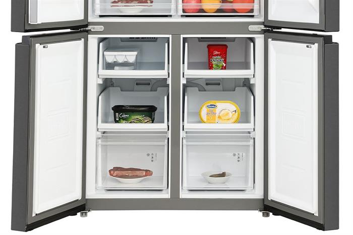Tủ lạnh Toshiba sở hữu thiết kế 4 cửa hiện đại với màu sắc xám sang trọng, dễ dàng kết hợp với mọi không gian nội thất trong nhà. Việc sở hữu 4 cửa không chỉ mang đến tính thẩm mỹ mà còn giúp tối ưu hóa không gian lưu trữ. Các ngăn tủ được phân chia rõ ràng, giúp người dùng dễ dàng quản lý thực phẩm mà không gặp phải tình trạng lộn xộn.