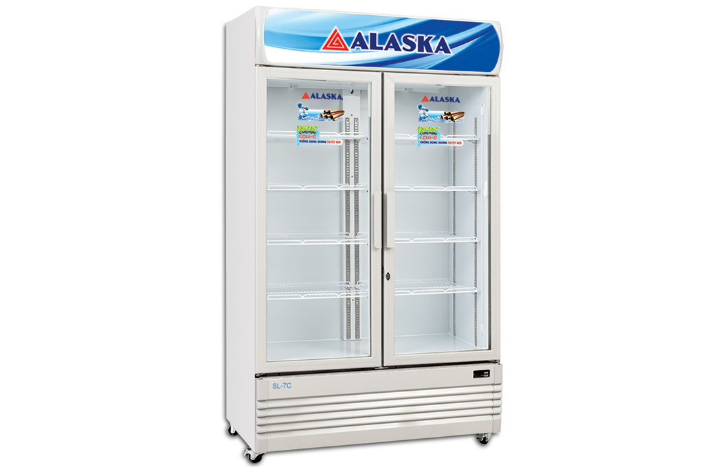 - Tủ mát Alaska SL-7C là dạng tủ mát cỡ lớn, dung tích 700L, dung tích sử dụng 580 lít, có thiết kế 2 cửa mở ngang, kính 2 lớp hút chân không công nghệ LOW-E giúp giữ nhiệt tốt, có sấy kính. Cửa đóng tự động. Lòng tủ bằng nhôm cao cấp.