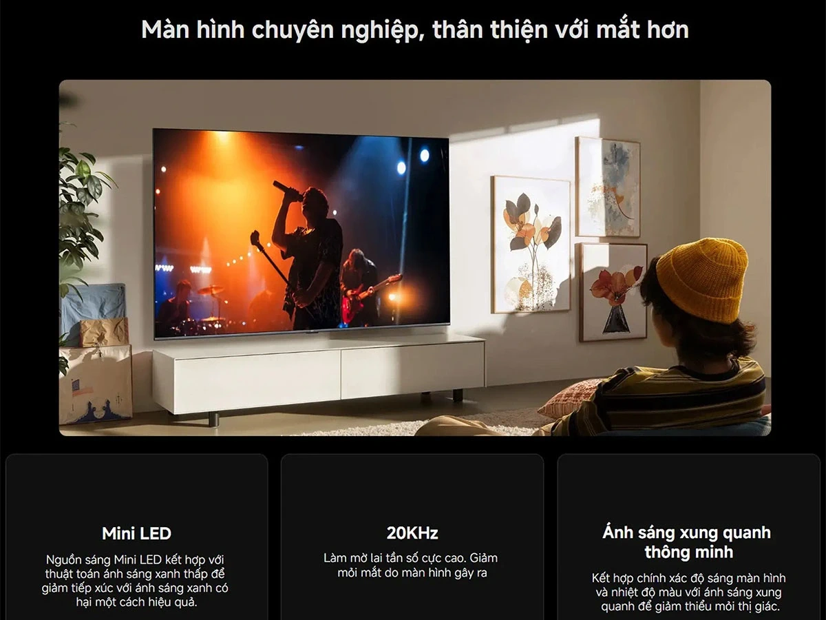 Xiaomi S Mini LED 98 inch 2026 được trang bị công nghệ Mini LED thế hệ mới với 880 vùng dimming độc lập, giúp điều chỉnh ánh sáng chính xác cho từng vùng trên màn hình. Điều này giúp giảm thiểu hiện tượng halo và rò sáng giữa các vùng sáng và tối, mang lại hình ảnh có độ tương phản cực kỳ cao, cùng với những chi tiết bóng đổ sắc nét.