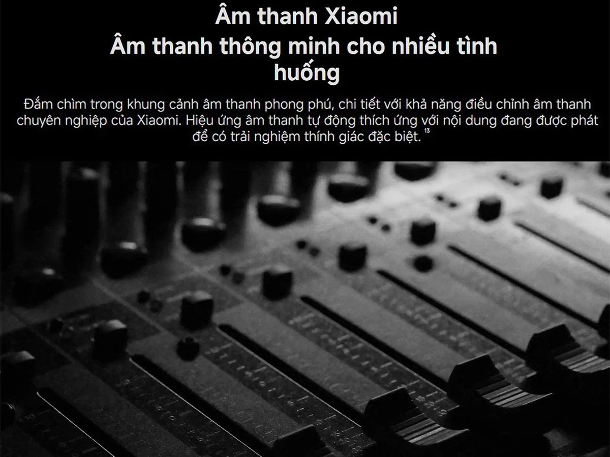 Tính năng Xiaomi Sound trên Google Tivi Xiaomi S Mini LED 98 inch 2026 tự động nhận diện loại nội dung đang phát (phim hành động, thể thao, âm nhạc, tin tức, hay phim hoạt hình) và điều chỉnh âm thanh phù hợp mà không cần người dùng can thiệp. Điều này giúp mang lại chất lượng âm thanh rõ ràng, cân bằng và chi tiết, phù hợp với từng thể loại nội dung mà không cần phải điều chỉnh thủ công.