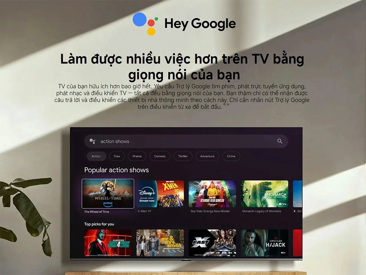 Bạn có thể yêu cầu TV tìm kiếm phim, mở ứng dụng, phát nhạc, điều chỉnh âm lượng hoặc truy vấn thông tin mà không cần phải sử dụng remote. Google Assistant còn có thể kết nối và điều khiển các thiết bị nhà thông minh trong hệ sinh thái của Google, như đèn thông minh, điều hòa, camera an ninh, hoặc khóa cửa thông minh.