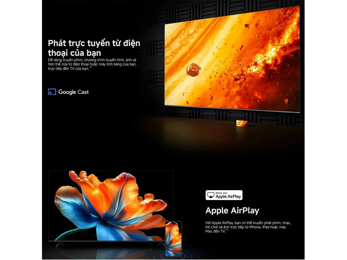 Xiaomi S Mini LED 98 inch 2026 hỗ trợ phản chiếu màn hình từ các thiết bị di động thông qua Google Cast và Apple AirPlay. Điều này giúp người dùng có thể chia sẻ nội dung từ điện thoại, máy tính bảng hoặc laptop lên màn hình tivi một cách dễ dàng và không dây. Sự hỗ trợ cả hai nền tảng giúp sản phẩm này phù hợp với cả người dùng Android và iOS.